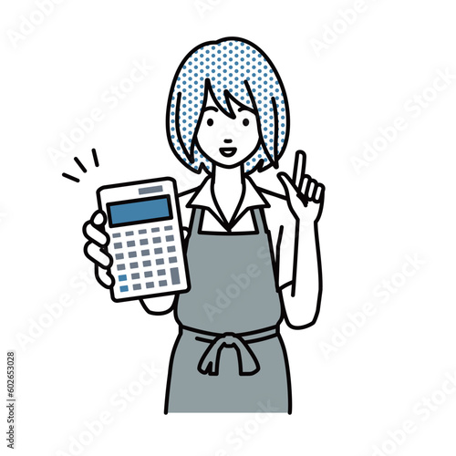 立って電卓を持ってこちらに向けて見せているエプロンをした店員の女性