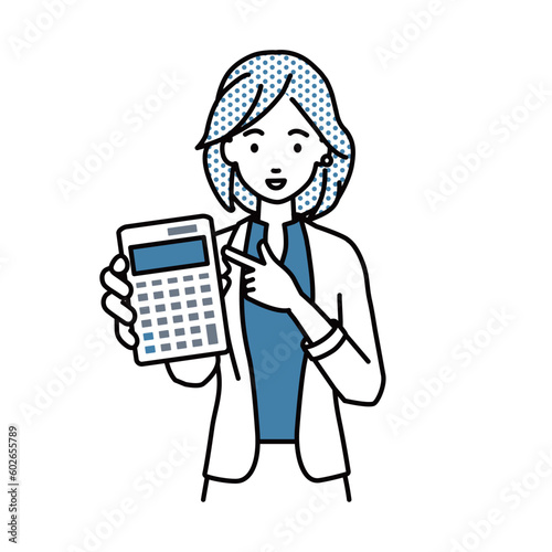 立って電卓を指差してこちらに向けて見せているジャケットの女性