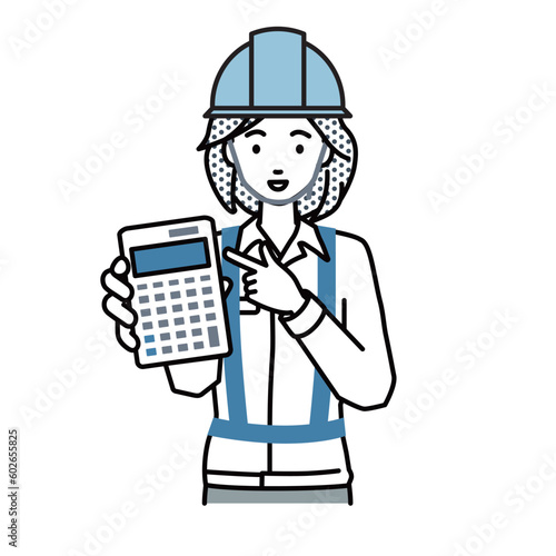 立って電卓を指差してこちらに向けて見せている工事現場の女性