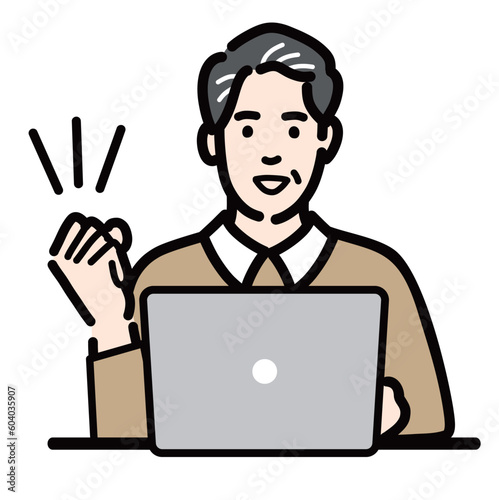 ラップトップの前に座って笑顔でガッツポーズをしている中年男性
