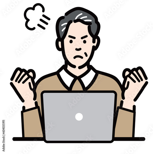 ラップトップの前に座って怒っている中年男性