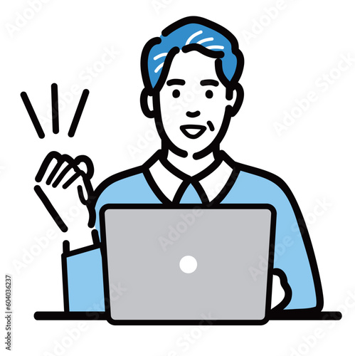 ラップトップの前に座って笑顔でガッツポーズをしている中年男性