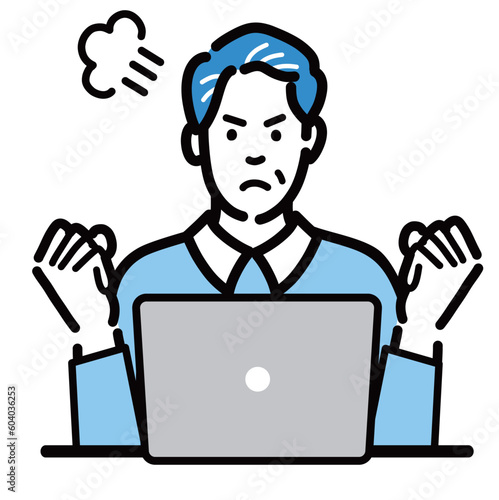ラップトップの前に座って怒っている中年男性
