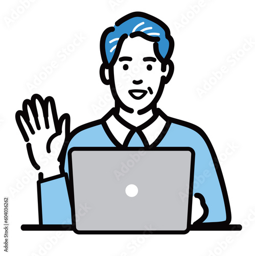 ラップトップの前に座って手を挙げて笑顔で挨拶している中年男性