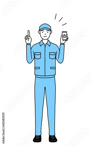 スマホのセキュリティ対策をする帽子と作業着姿の男性