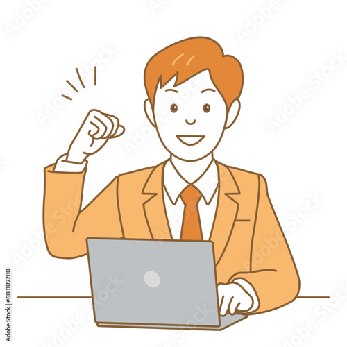 パソコンの前でガッツポーズのスーツ男性