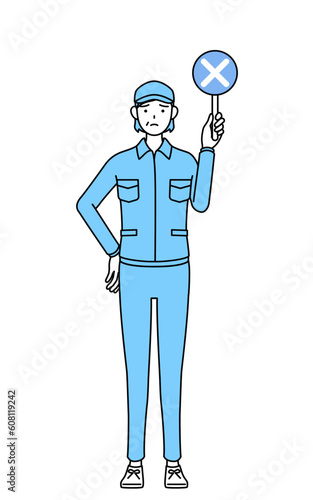 不正解を示す×の棒を持つ帽子と作業着姿のシニア女性(経営者、管理職、上司)