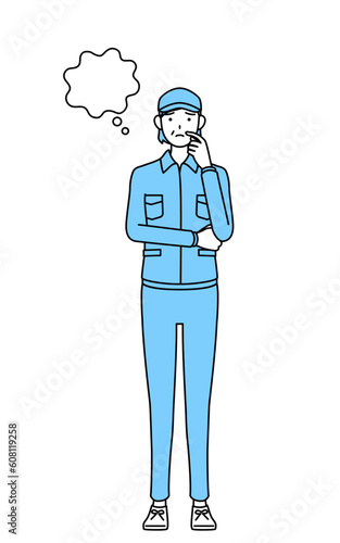 顔をかきながら考える帽子と作業着姿のシニア女性(経営者、管理職、上司)