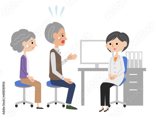 診察室で女医に不安を話すシニア夫婦
