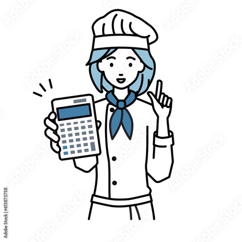 立って電卓を持ってこちらに向けて見せている調理師の女性