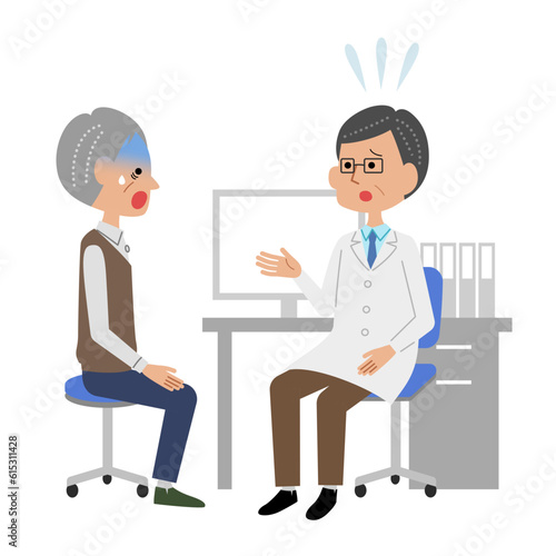 診察室で男性医師に説明を受けてショックを受けるシニア男性