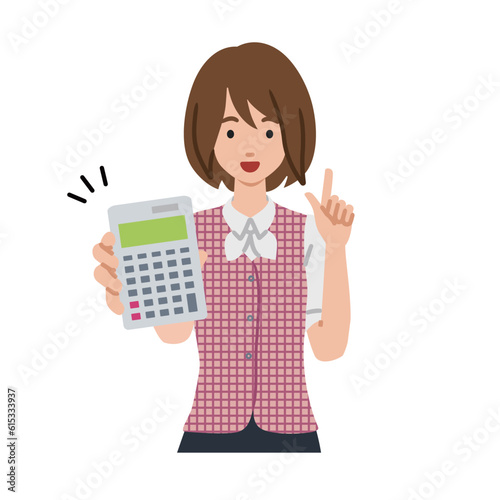立って電卓を持ってこちらに向けて見せている事務員制服の女性