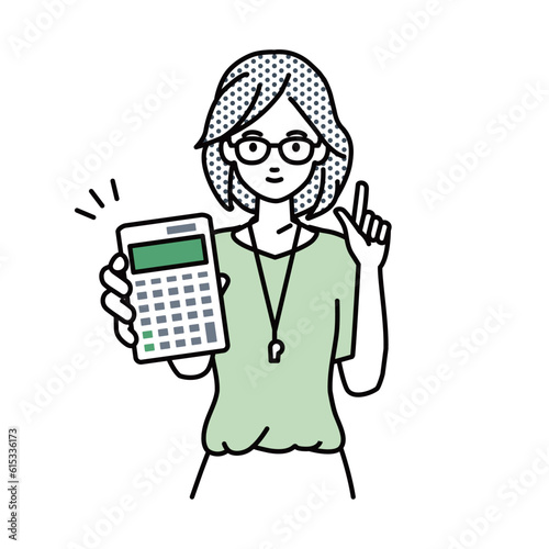 立って電卓を持ってこちらに向けて見せている教師の女性