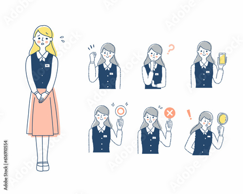 people, illustration, smile, woman, waist up, expression, variation, set, pose, young, ok, attendant, operator, reception, uniform, refer, occupation, concierge, receptionist, good, foul, 30s, gesture, stand, problem, smartphone, question mark, surprised, circle, placard, magnifying glass