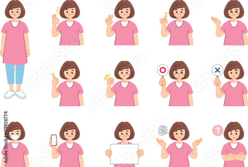 若い女性 表情とジェスチャーのイラスト素材セット