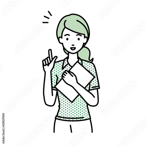 立って書類を手に持って何かひらめいたポロシャツの女性