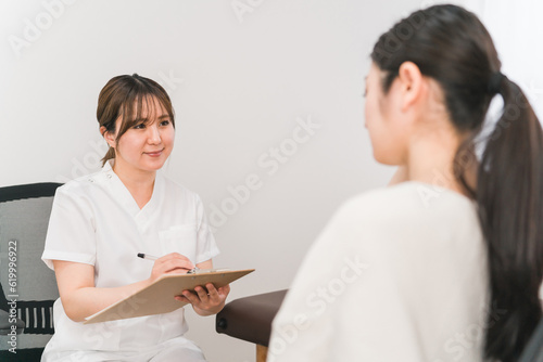カウンセリングする白衣の女性(看護師・カウンセラー・エステティシャン)