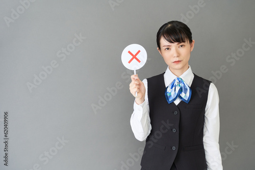 マルバツの棒を持つベストにリボンタイの制服を着た、受付業務、事務業務の女性