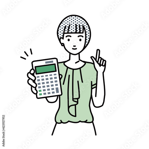 立って電卓を持ってこちらに向けて見せているオフィスカジュアルの女性