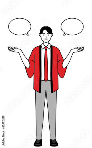 ふきだしつき、比較をする赤い法被を着た販売員の男性