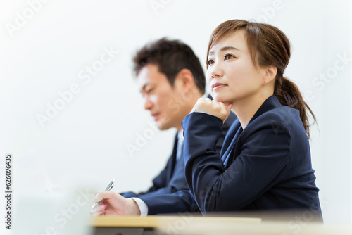 企業・会社の説明会・勉強会・プレゼン・講習会・セミナー・研修で講師の話を聞く生徒・ビジネスウーマン