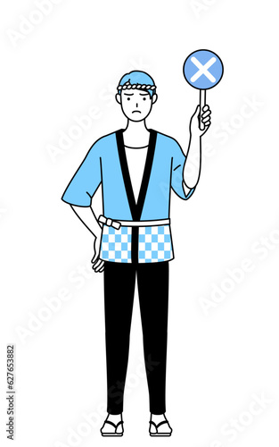 不正解を示す×の棒を持つ夏祭りの法被を着た男性