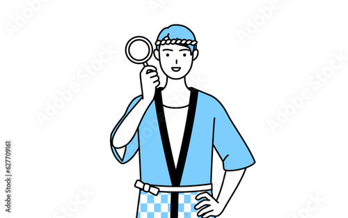 虫メガネをのぞく夏祭りの法被を着た男性