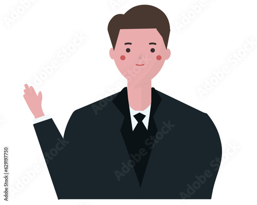 笑顔で案内をするスーツを着た男性。ベクターイラスト