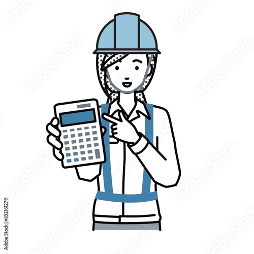 立って電卓を指差してこちらに向けて見せている工事現場の女性