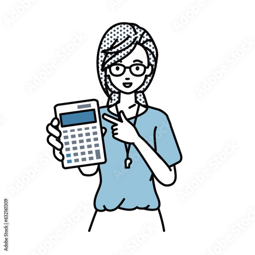 立って電卓を指差してこちらに向けて見せている教師の女性