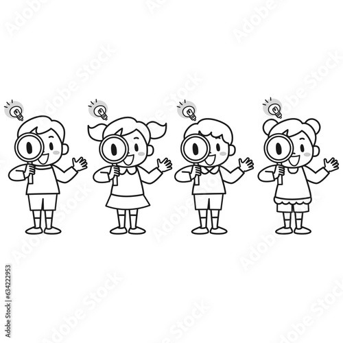 虫メガネをのぞいて発見があった子供のイラストセット
