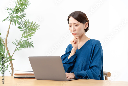 パソコンの前で悩む女性