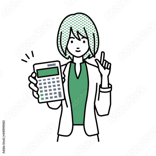 立って電卓を持ってこちらに向けて見せているジャケットの女性