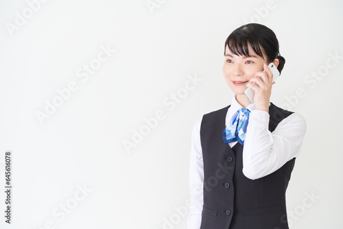 スマートフォンで電話をするベストにリボンタイの制服を着た、受付業務、事務業務の女性