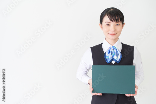 黒板を持つベストにリボンタイの制服を着た、受付業務、事務業務の女性
