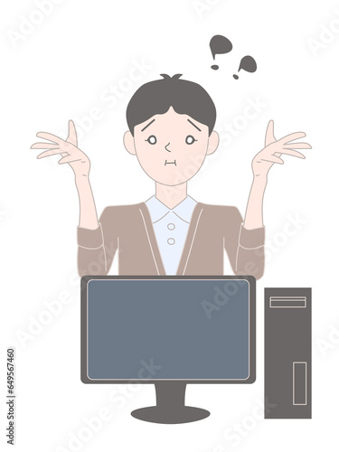 困る ビジネスカジュアルの服装をした男性 デスクトップパソコン エラー