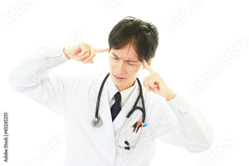cephalalgia, pain, doctor, doctor, doctor, man, man, medical care, care, welfare, health, people, business, apprehension, fatigue, overwork, fatigue, medicine, japanese, cosmetic, model, marode, face, hair, exam, diagnosis, healthful, good-looking, treatment, hospital, clinic, clinic, depression, flop, labcoat, japan, office, clean, white background, unrest, copy space, pose, work, uniform, training