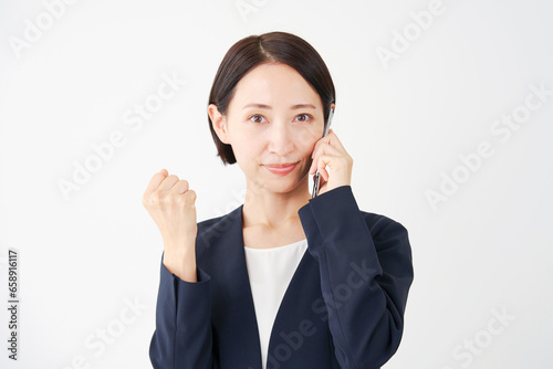 スマートフォンで電話しながらガッツポーズをするビジネスウーマン 白背景