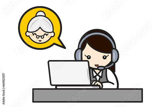 パソコンに向かいながらおばあさんからの電話を受けるコールセンター女性