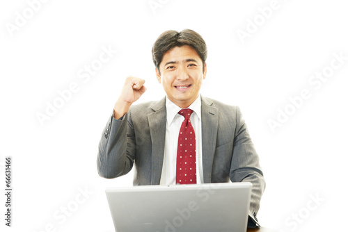 personal computer, man, man, smile, people, success, businessman, business, health, happy, happiness, japanese, glory, hope, raise, achievement, victory, promotion, face, hair, courage, tenacity, cosmetic, model, healthful, good-looking, office, light, clean, white background, copy space, pose, work, uniform, adult, expression, japan, corporate, employee, adult, work