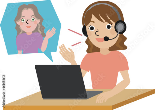 オンラインで外国人の先生と英会話をしているヘッドセットを着用した日本人女性