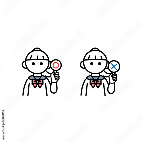 マルとバツの札 女子学生