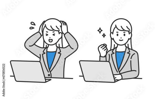 パソコンを見て焦る・ガッツポーズをするビジネスパーソン女性のセット【人物ベクターイラスト素材】
