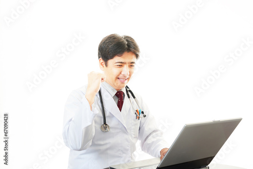 personal computer, man, man, success, doctor, doctor, people, smile, doctor, medical care, care, welfare, health, cosmetic, notebook, cyberspace, personal computer, japanese, model, marode, happy, happiness, exam, diagnosis, healthful, good-looking, treatment, hospital, clinic, clinic, victory, glory, achievement, labcoat, japan, internist, office, business, light, clean, white background