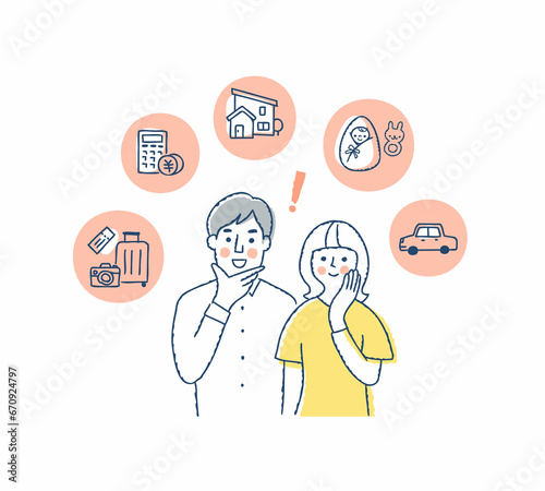 笑顔の若いカップルと生活アイテムアイコン