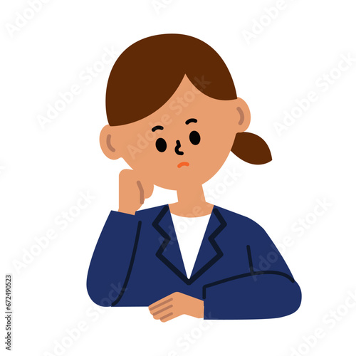 ビジネスパーソン 考える 困る 悩む 頬杖 女性 仕事 スーツ イラスト