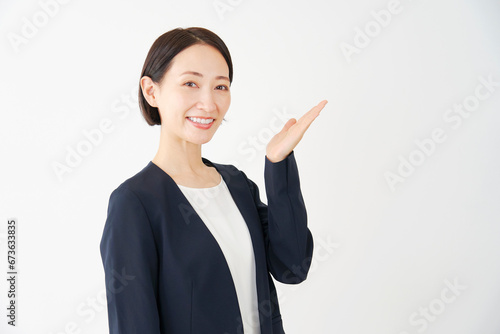 手のひらで右側を指す中年のビジネスウーマン 白背景