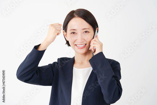 スマートフォンで電話をしながらガッツポーズをする中年のビジネスウーマン 白背景