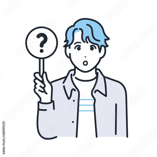 クエスチョンマークの札を持つカジュアルな服装の若い男性のシンプルなベクターイラスト素材