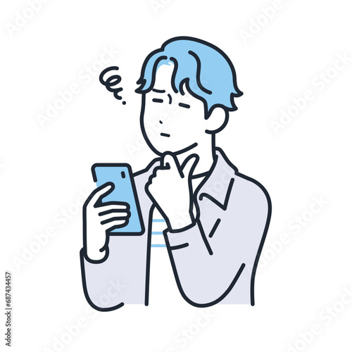 スマートフォンを持って悩むカジュアルな服装の若い男性のシンプルなベクターイラスト素材